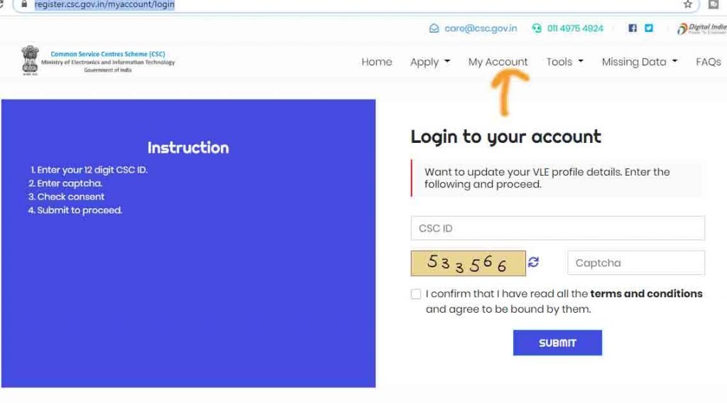 - अब आपको यहां पर CSC आईडी डाला होगा उसके बाद अपना कैप्चा कोड भरें यहां पर चेक मार्क लगाएं